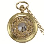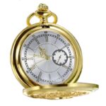 Een kast met sobere en zuivere lijnen wordt geaccentueerd door een ontwerp van opengewerkte bladeren rond een opening die zorgvuldig bewerkte secondewijzers en een chronograaf onthult. Wanneer geopend, biedt de luxueuze wijzerplaat de tijdsaanduiding in een kwartsuurwerk, met een dubbele analoge weergave en een chronograaf-secondenwijzer. Dit antieke zakhorloge met halve jager, gedragen als halsketting met een lengte van 80 cm, is een luxe accessoire dat uw elegantie en smaak voor mooie dingen uitstraalt.
