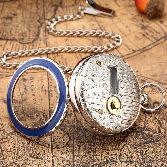 Door de transparante klepel met blauwe rand kunt u de elegante glazen wijzerplaat bewonderen. Als u op de bovenkant van de kroon drukt, zakt de beschermende ring en wordt het hele horloge zichtbaar onder het transparante glas. Het bovenste deel herbergt het kwartsuurwerkmechanisme, versterkt door de gouden wijzers en de verfijnde index met Romeinse cijfers. Het onderste deel integreert het muzikale opwindmechanisme op de achterkant van het horloge. De achterkant van het horloge is in reliëf gegraveerd om een aangename sensatie in de hand te geven telkens wanneer de tijd wordt afgelezen. Met de mechanische kroon op de achterkant kan het muziekmechanisme in zijn geheel worden opgewonden, wat een melodieus geluid oplevert voor alle leden van het gezin. Met zijn kleine blauwe olifant gegraveerd op de wijzerplaat, is dit zakhorloge perfect nauwkeurig dankzij de kwartsbatterij geïntegreerd in de achterkant van de kast. De batterij heeft een levensduur van twee tot vijf jaar en kan gemakkelijk worden vervangen door de achterkant van het horloge te openen of door het naar een plaatselijke horlogemaker te brengen. Dit originele zakhorloge wordt geleverd met een riemketting die bij het metaal van de kast past en is meteen na het uitpakken klaar om te dragen.