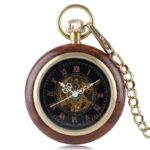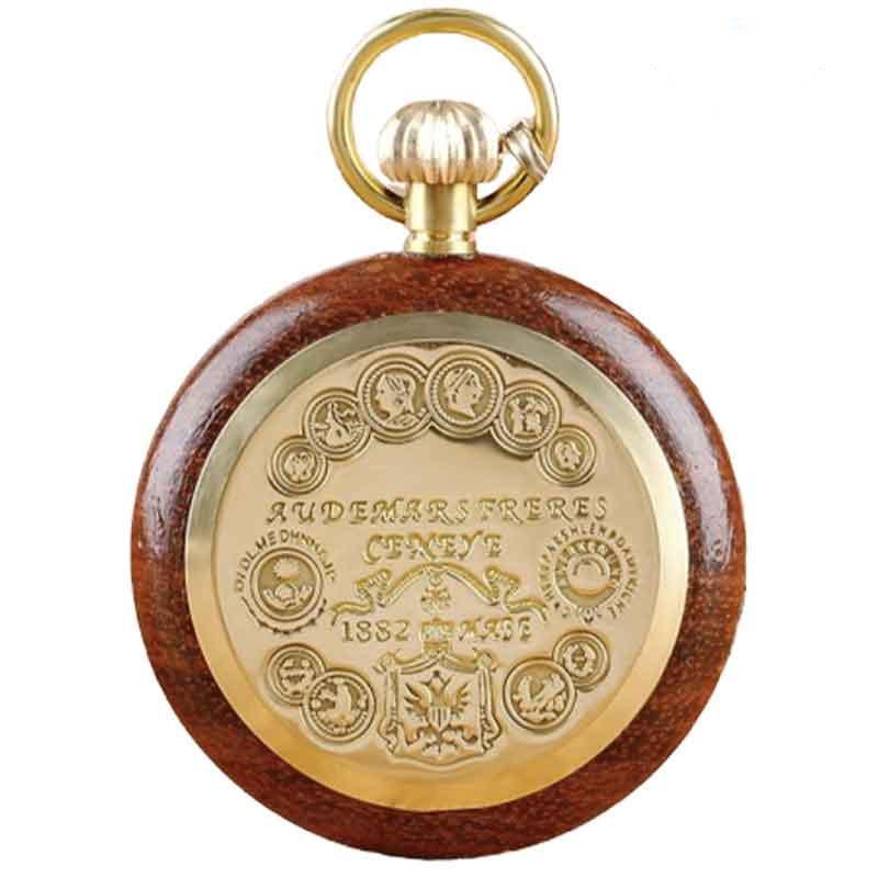 De kast van dit zakhorloge met houten lambrisering onthult de wijzerplaat met zijn kwartsuurwerk van de secondewijzer onder het acrylglas gesublimeerd door de bijpassende gouden ketting.