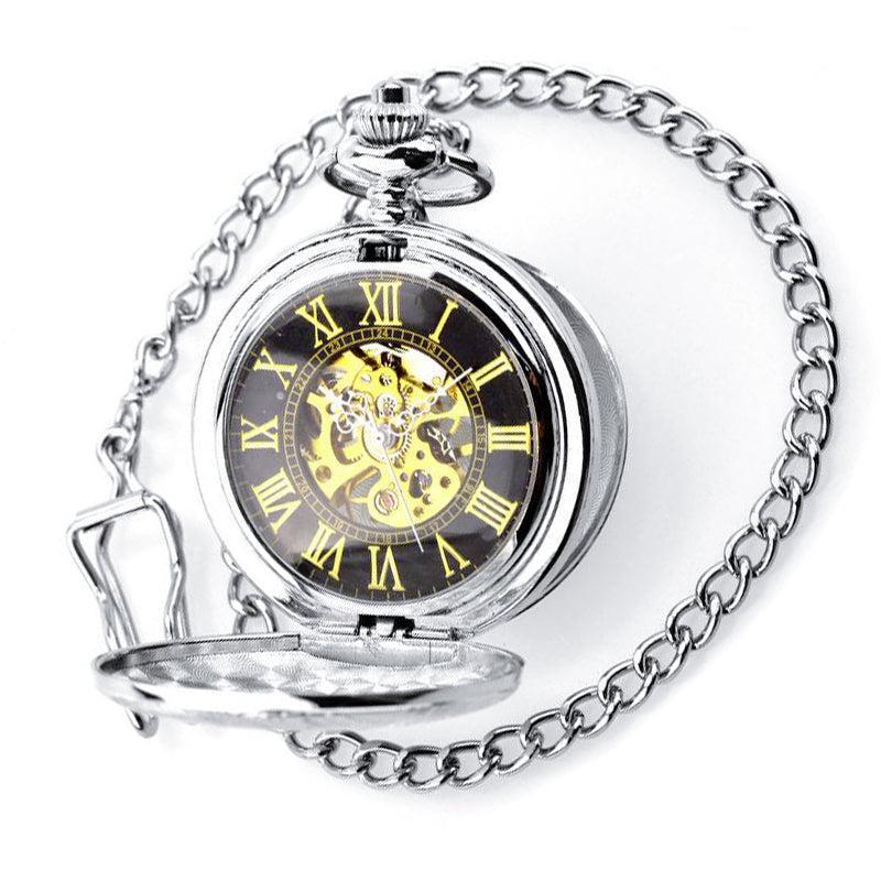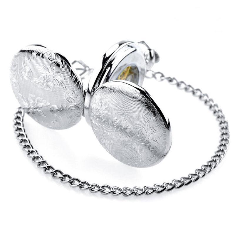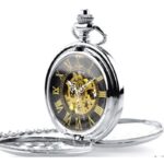 De zwarte en gele index contrasteert met de zachtheid van de bloemmotieven en geeft dit zakhorloge een modern tintje. Op de lichtgevende wijzerplaat zijn drie kleine witte wijzers te zien die rond een Romeinse cijferindex lopen om de precieze en nauwkeurige tijd weer te geven. Het skeletvormige ontwerp van het klokwerkhart van hoge kwaliteit maakt het mogelijk het draaiende uurwerk van hoge kwaliteit te bewonderen.