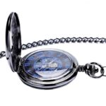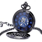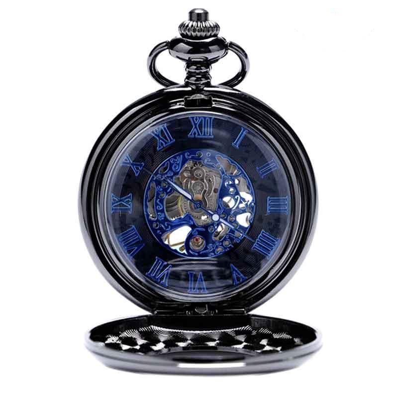 Een stijlvol en uniek zakhorloge dat het innerlijke skelet en het uurwerkmechanisme onthult. De transparante sluiting van het zakhorloge onthult het met de hand bediende mechanisme, terwijl de Romeinse cijfers voor de tijd verborgen blijven. De ronde wijzerplaat met zwarte achtergrond heeft een natuurlijke donkere kleur die het horloge karakter geeft. Het zakhorloge voor heren geeft het tempo aan van de seconden, minuten en uren met de secondewijzer, de bewakers van de tijd, dankzij het handgewikkelde uurwerk. De blauwe Romeinse cijfers op een zwarte achtergrond hebben een retro-analoge display en indexen voor een volledige 24-uurs weergave. Boven de middag zit een zorgvuldig vervaardigde kroon in stijl. Met een even open blik, een ring houdt de ketting vast. De binnenkant van de sluiting, minutieus bewerkt met een designgrafiek, evenaart de elegantie van het hout en de schakels van de ketting.