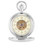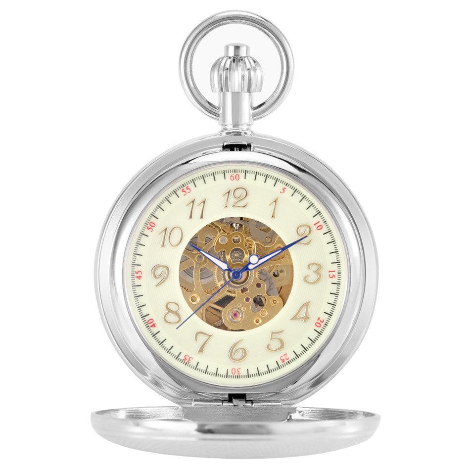 Als u op de kroon drukt, komt de bezel aan de voorkant charmant naar beneden en wordt een retro wijzerplaat met Arabische cijfers zichtbaar. De drie blauwe wijzers bewegen elegant op het ritme van de mechanische opwinding, die kan worden geregeld door de kroon met de hand te draaien of door onbewuste rukjes van de pols om moeiteloos te worden opgewonden. Geleverd met een slangenketting die past bij het zilverkleurige metaal van de kast, is dit zakhorloge direct klaar om te dragen zodra het is uitgepakt en past het zowel bij elegante ceremoniële outfits als bij meer casual moderne kleding.