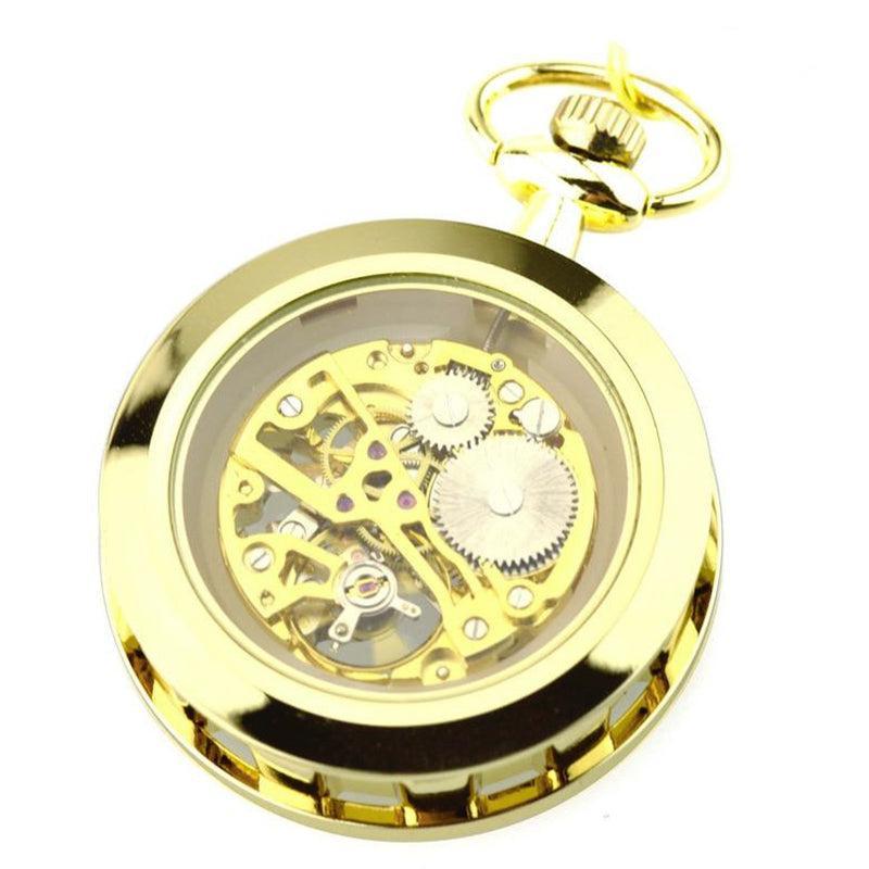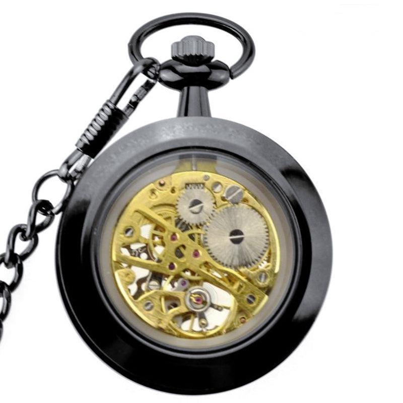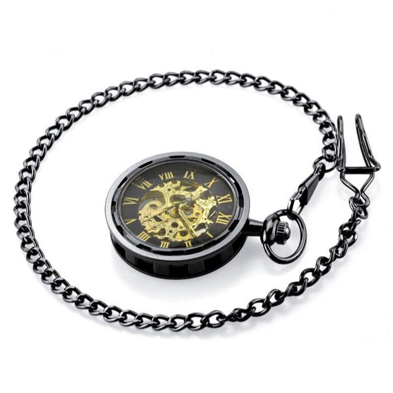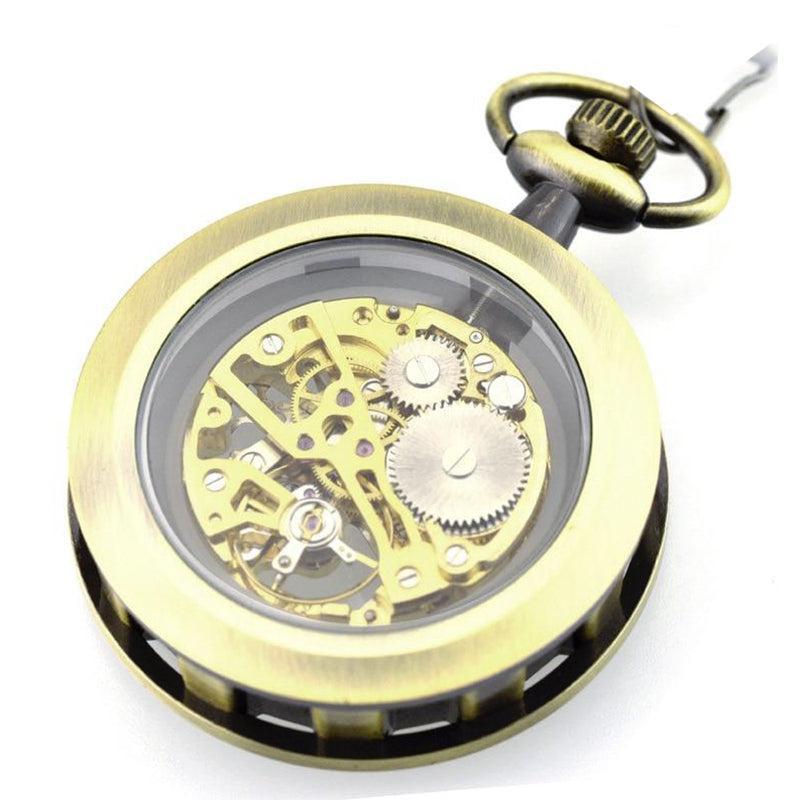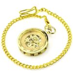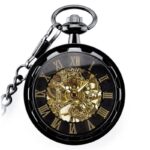 Goud, zilver, brons en carbon zwart worden gecombineerd met goud om een zeer luxueus kwaliteitshorloge te bieden. Ideaal om cadeau te geven. Het kan aan een ketting worden gehangen die bij de kast past en wordt samen met het horloge geleverd. De achterkant van het horloge onthult een glazen bezel die een meeslepend zicht biedt op het uurwerk. De tijd aflezen terwijl je een horlogespektakel bewondert, dat is de belofte van dit sensationele zakhorloge.