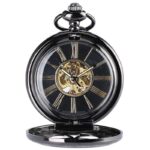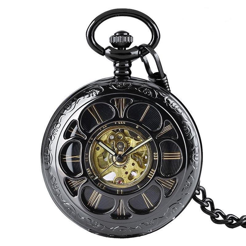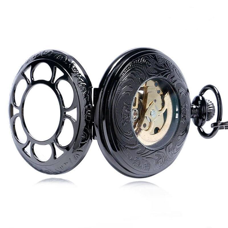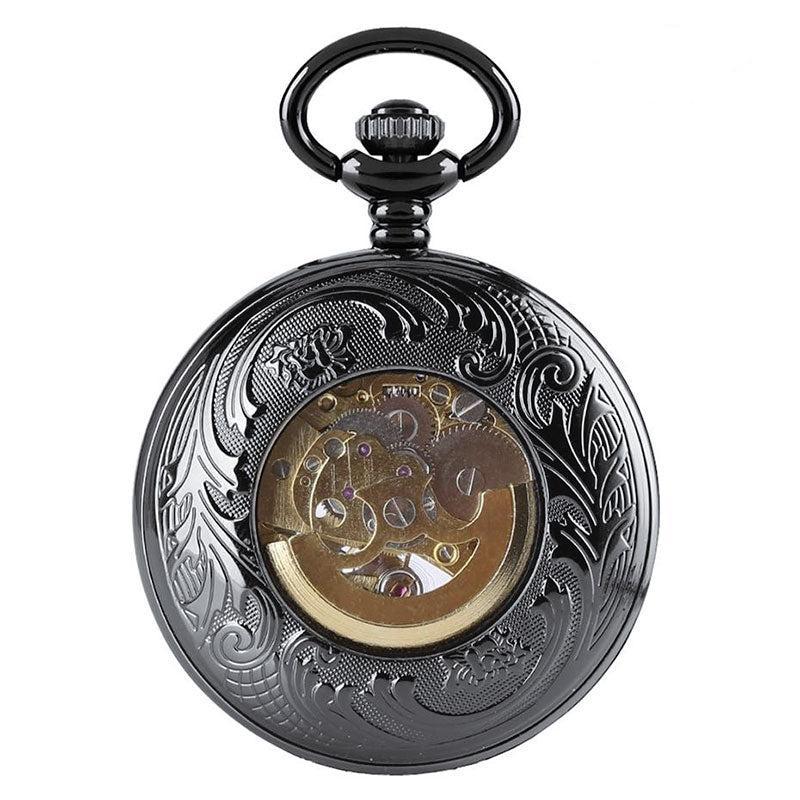 Door de elegante beschermende klep komen de Romeinse cijferindexen tevoorschijn, die het dankzij de drie fijne wijzers mogelijk maken om de tijd gemakkelijk af te lezen zonder de bezel te laten zakken. Om de mechanische beweging in actie te bewonderen, kan de kroon 's middags zachtjes omlaag worden gedrukt. Rond de gouden index biedt het uurwerk in volle beweging de drager een adembenemend schouwspel van horlogerie. De bovenste kroon, tegen de klok in gedraaid, windt het mechanisme op en vult de gangreserve van dit mechanische zakhorloge voor meerdere uren autonomie. De glazen achterzijde van het horloge onthult het achterste mechanisme, dat liefhebbers van horlogemakers ongetwijfeld zal aanspreken. Dit prachtige zakhorloge in steampunkstijl wordt geleverd met een schuifketting en is meteen klaar om te dragen zodra het is uitgepakt.