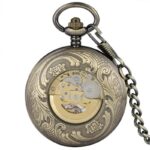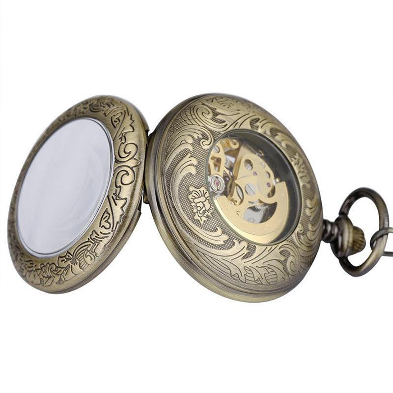 De fijne witte wijzers draven over de wijzerplaat met het authentieke hart en de zichtbare uurwerkwielen. Hij sublimeert het skelet, vintage en klassieke stijlen die ideaal zijn om cadeau te geven of te verzamelen, en biedt de drager een riemgespketting om hem aan de kast te bevestigen.