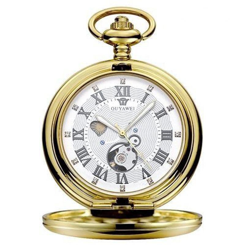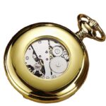 De verfijnde wijzerplaat heeft een maanfaseweergave waarmee u de verschillende kanten van de maan direct op het horloge kunt zien. De Romeinse cijferindex heeft kleine diamantjes boven de cijfers en geeft dit zakhorloge een chique accent. De achterkant van het horloge heeft een bezel die een meeslepend zicht biedt op het gemechaniseerde hart van dit juweel van een horloge. Het zakhorloge wordt geleverd met een clip-ketting die bij de kast past.