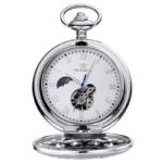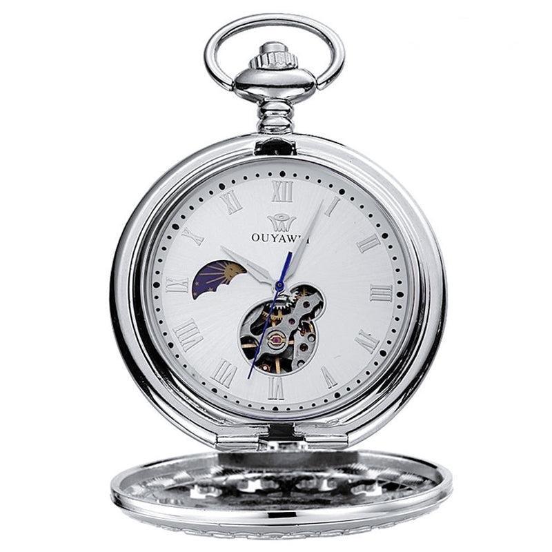 Dit tijdloze, universele uurwerk in zilverkleur heeft een chique opengewerkte kast die opengaat door op de opwindkroon te drukken, met daarboven een ring in dezelfde tint om de ketting in op te bergen. De witte wijzerplaat heeft een uitzonderlijk design met door een mechanisch uurwerk aangedreven secondewijzers en een diafragma dat de werking van het uurwerk onthult. Dit uitzonderlijke model heeft een uniek maanfasevenster op de wijzerplaat.