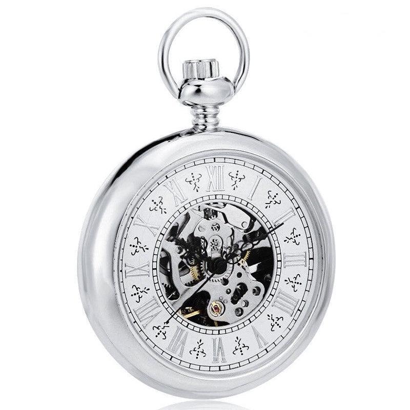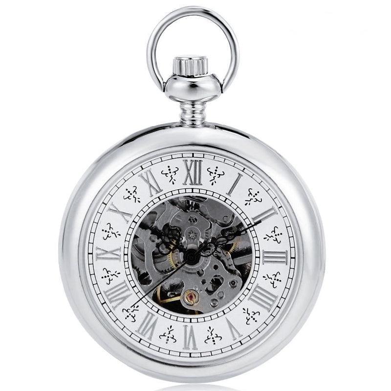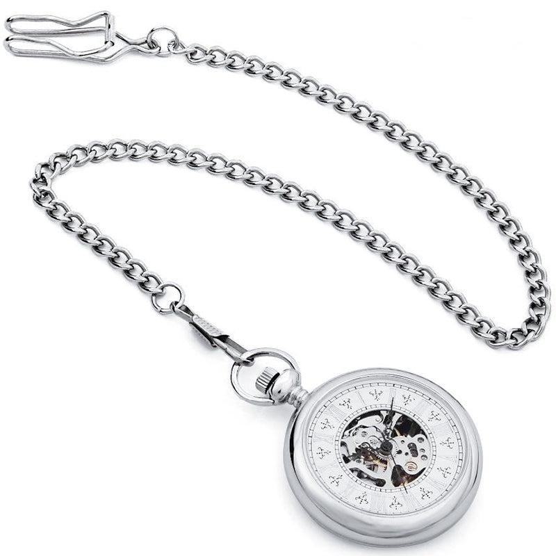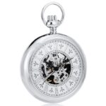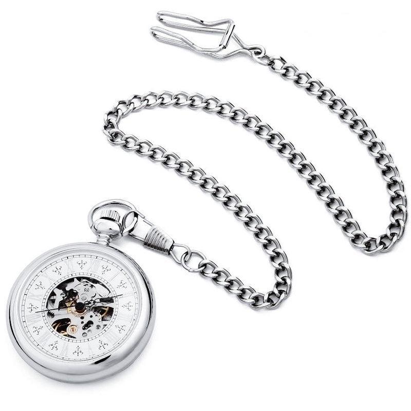 De zilveren kast met open wijzerplaat is het perfecte model om te dragen bij formele en casual outfits. Het skelethart onder de wijzerplaat maakt het mogelijk de mechanische wielen in beweging te bewonderen terwijl u de tijd afleest. De grote Romeinse cijferindex wordt aangeduid door de drie slanke wijzers die met precies de juiste hoeveelheid tijdprecisie bewegen op het ritme van de mechanische opwinding. De achterkant van het horloge is solide met geborsteld metaal dat een aangenaam gevoel van authentiek materiaal achterlaat bij het aanraken. Dit zakhorloge wordt geleverd met een bij de kast passende zilveren riemketting en is meteen na het uitpakken klaar om te dragen. Voor zowel mannen als vrouwen is dit uitzonderlijke uurwerk een uniek geschenk om te geven of om jezelf te geven.