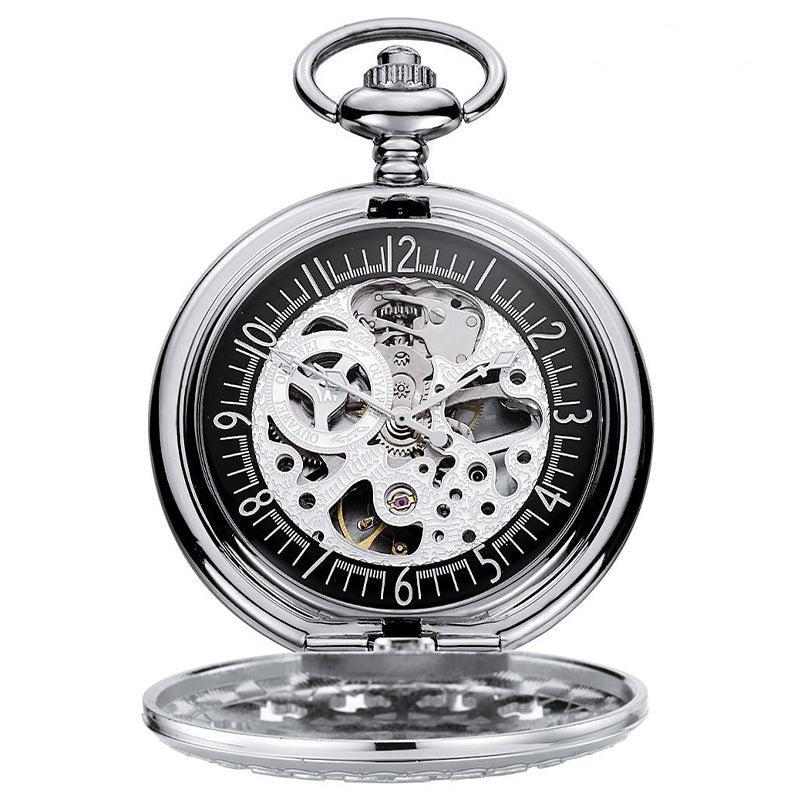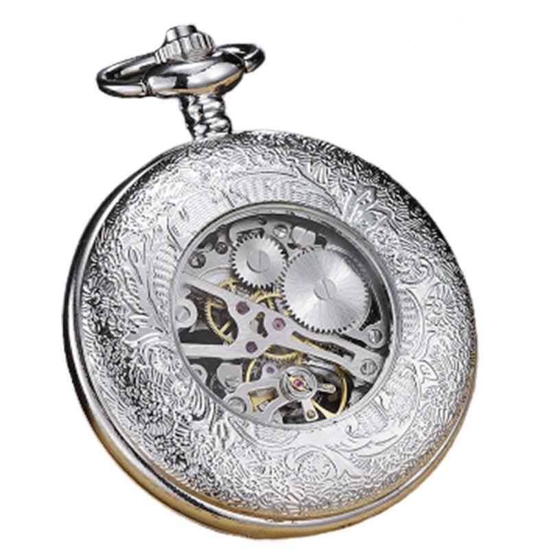De precieze index met klassieke cijfers deelt het glas van de wijzerplaat met de verzilverde horlogewielen die de drager een perfecte tijd geven. Het heeft een bijpassende clip ketting om dit mooie uurwerk veilig op te hangen. De voorklep is versierd met esthetische barokversieringen en de achterkant biedt een blik op het inwendige mechanisme van dit precisiezakhorloge.