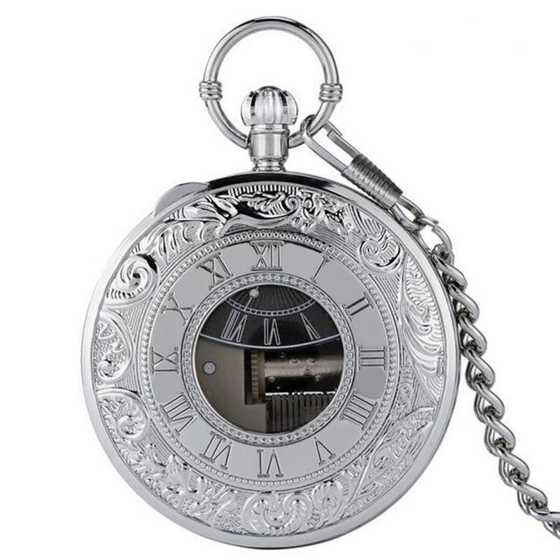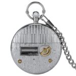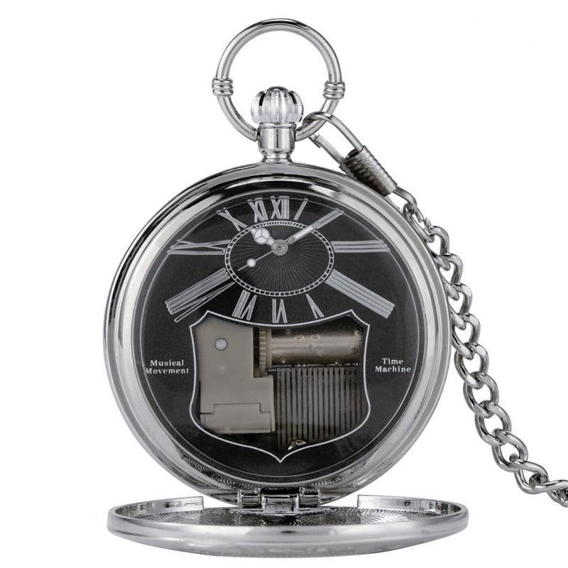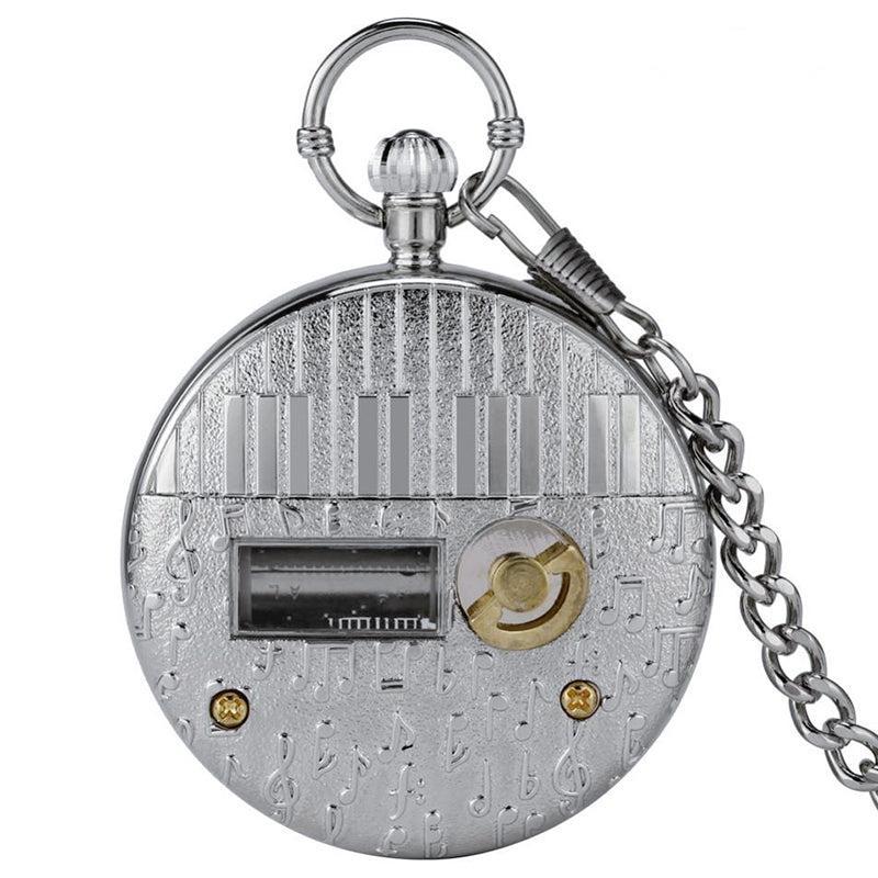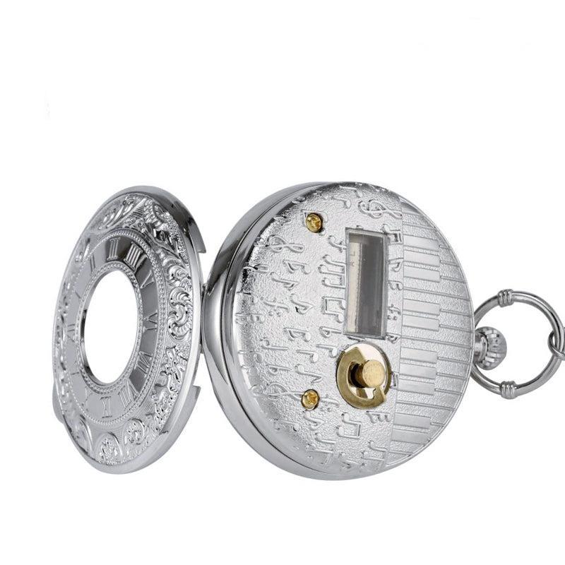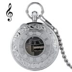 Dit zakhorloge is gevat in een zilveren halfjager kast en heeft een Japans quartz uurwerk van hoge kwaliteit. De drie handen onder het glas worden geanimeerd door een precieze draf om zijn gastheer een aangenaam moment te bieden om te lezen terwijl hij luistert naar de zachte melodie die is gecomponeerd. In het grote doorzichtige glas is de roestvrij stalen muzikale krul gehuisvest die men kan zien draaien terwijl de muzieknoten voorbijschuiven. Met de bovenste kroon kunnen de drie secondenwijzers in het midden van de ovale Arabische cijferindex op de juiste tijd worden ingesteld door ze in de normale richting met de wijzers van de klok mee te draaien. Als u het horloge omdraait, ziet u een solide achterkant met een gouden opwindsleutel die dit ongewone zakhorloge zijn symfonische ritme geeft. Zowel voor mannen als vrouwen is dit zakhorloge met muziekdoosje klaar om te dragen zodra het is uitgepakt, dankzij de bijpassende riemketting die bij het etui wordt geleverd.